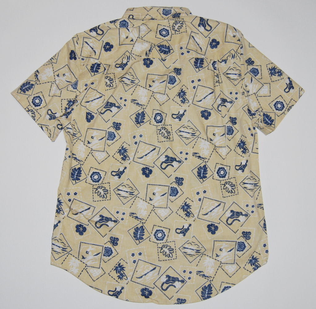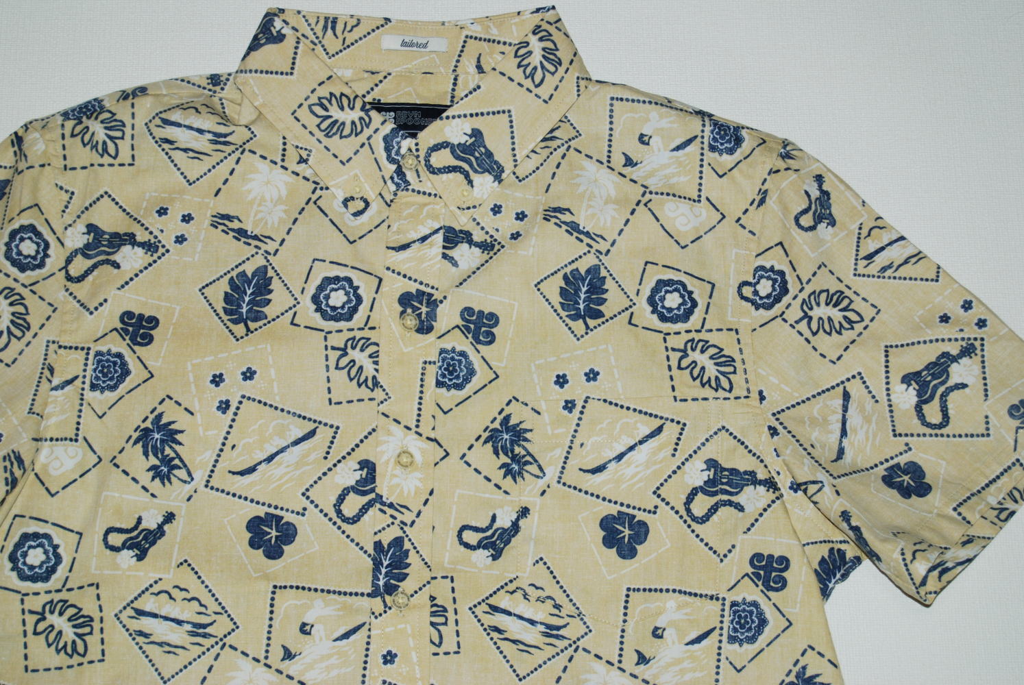 クリームと言うべきか?薄いイエローと言うべきか?迷ってしまうほど微妙な色使いの作品!まぁもうこのカラーリングが気に入ってしまったら「買い」でOKです!だって他では手に入らないようなカラーだから!描かれているのはサーファー、カヌー、ハイビスカスにウクレレとハワイを思いっきり意識した物!レインスプーナーがハワイアンシャツメーカーだということがハッキリ分かります!アロハ万歳! ★